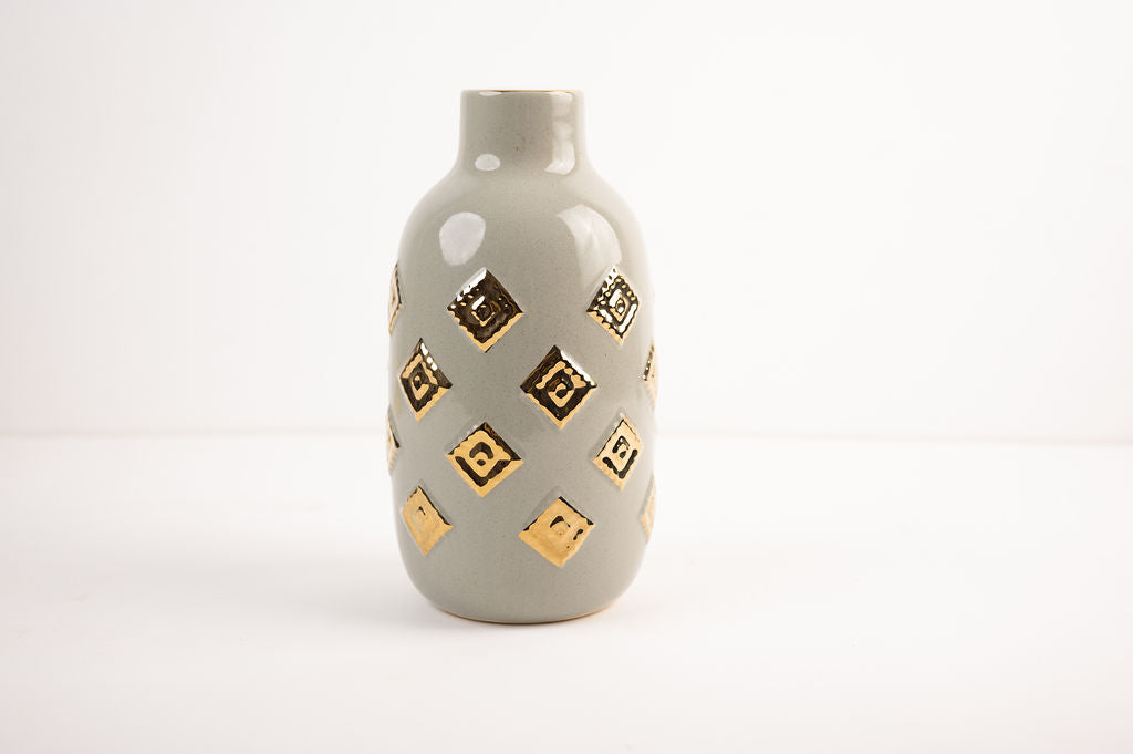 Transform any space into a work of art with Raku - the vase with a golden glaze and unique rectangular pattern. Elevate your home decor with this playful yet chic addition.