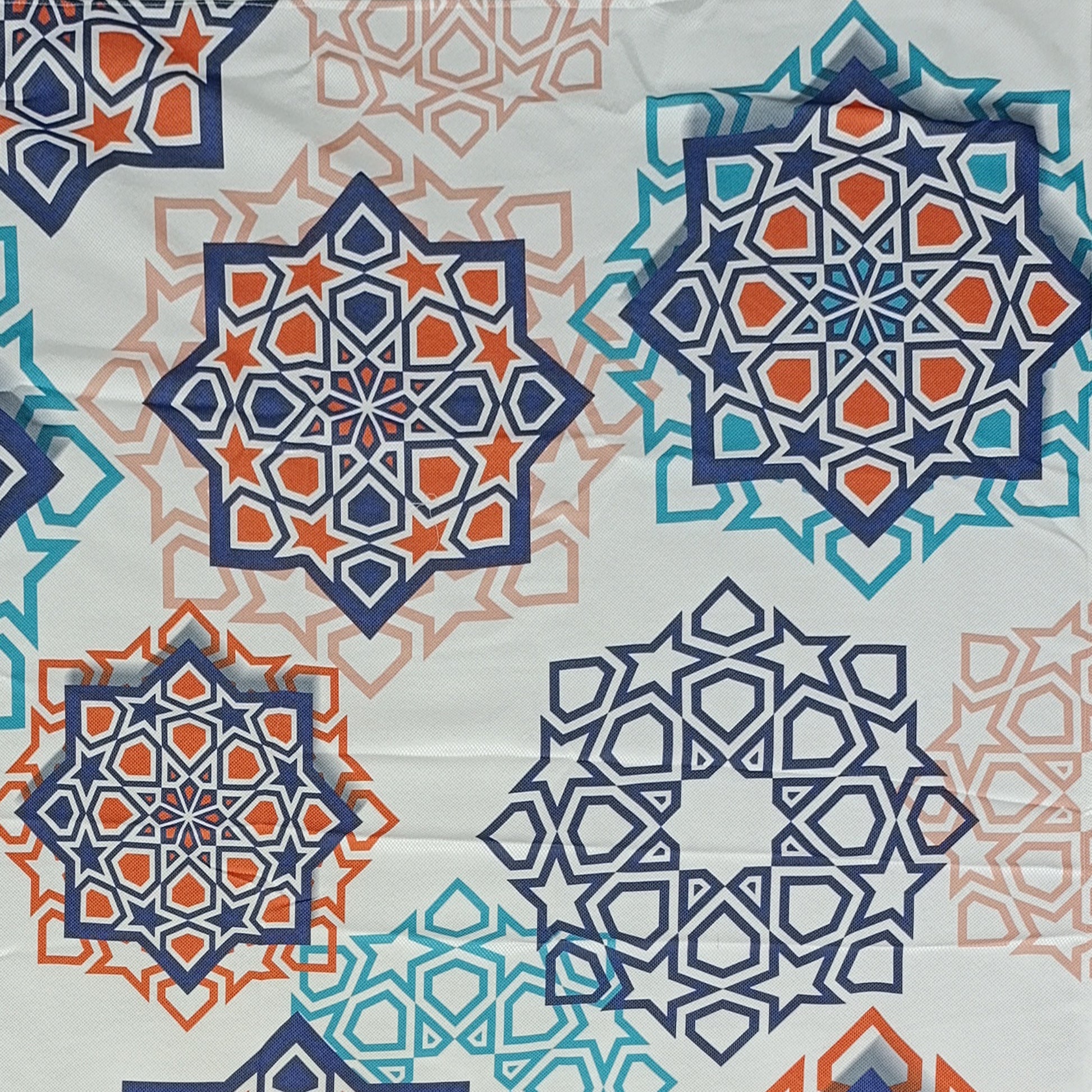 Transform your dining space into a festive celebration with this elegant Ramadan tablecloth featuring intricate Islamic-inspired designs. The pristine white fabric is beautifully adorned with gold-printed motifs including traditional lanterns, crescent moons, ornate stars, and delicate mandala patterns that capture the spiritual essence of Ramadan and Eid celebrations. Each decorative element showcases exquisite geometric detailing that adds a touch of sophistication to your table setting. This decorative table cover creates the perfect backdrop for iftar gatherings, suhoor meals, and Eid festivities, bringing warmth and elegance to your dining experience. The timeless gold and white colour scheme complements any dining room décor whilst honouring the rich cultural traditions of the holy month. Whether you're hosting family dinners or special celebrations, this tablecloth protects your table surface whilst creating a memorable atmosphere for your guests. The Islamic lantern and celestial motifs serve as beautiful conversation starters and add meaningful symbolism to your dining occasions throughout the blessed month of Ramadan.