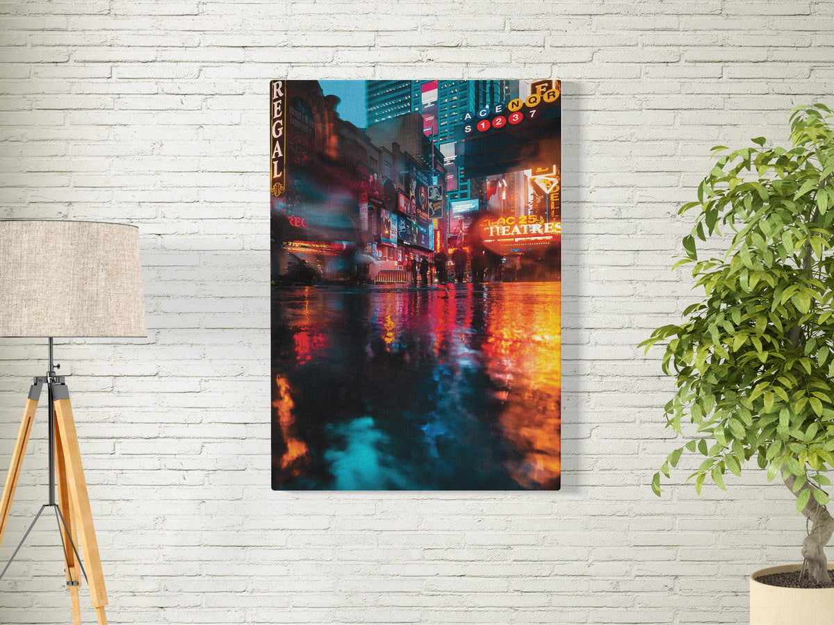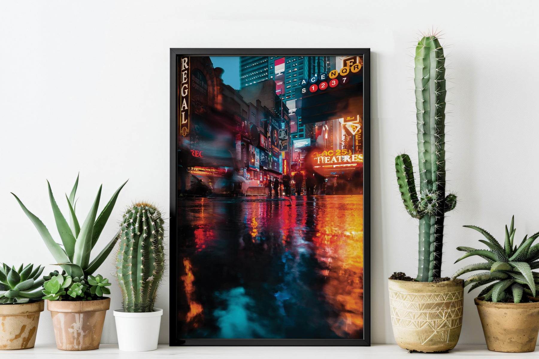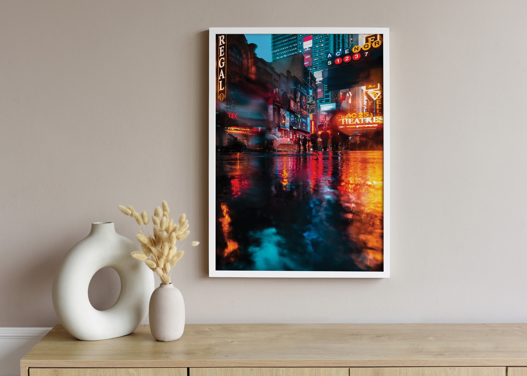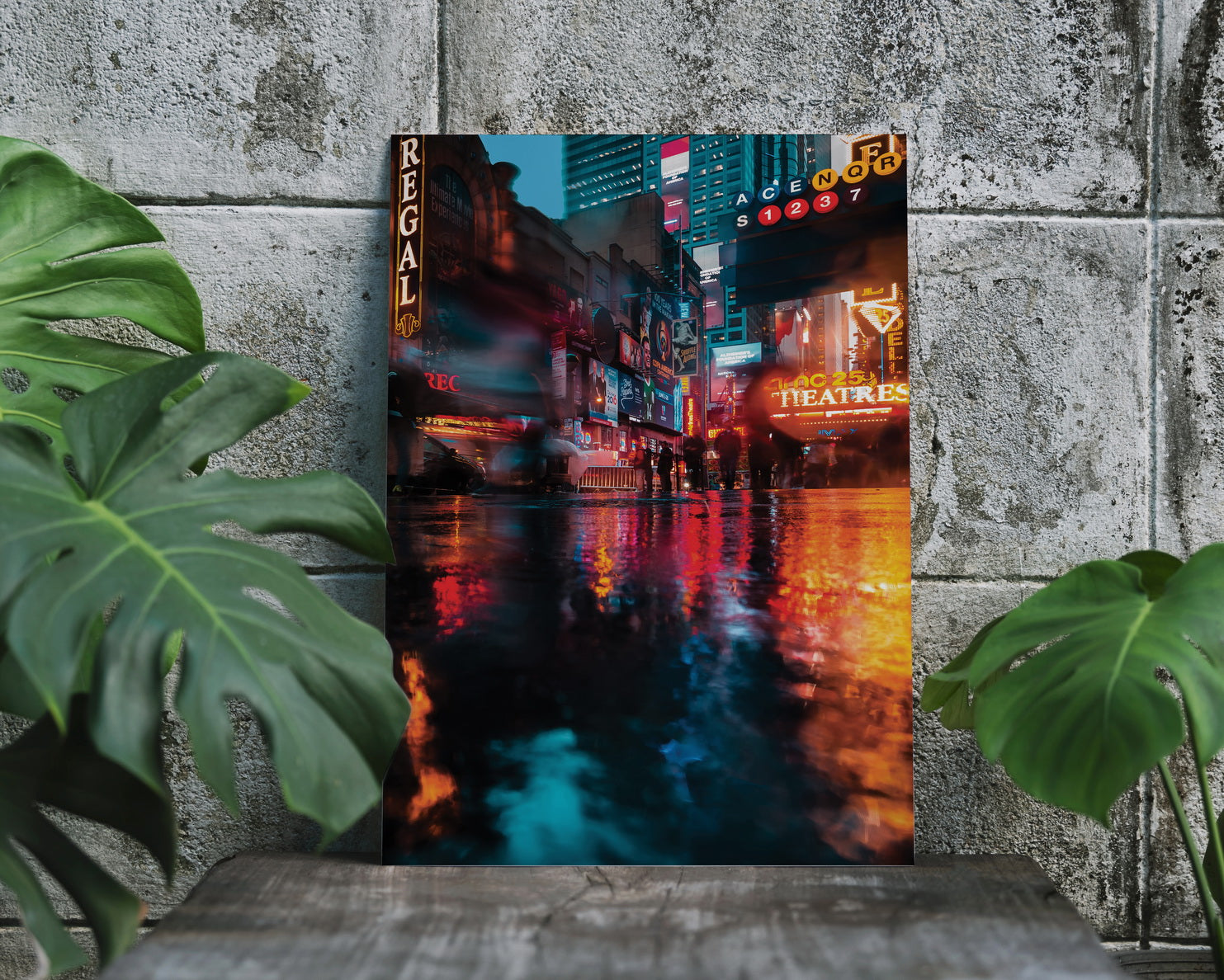 Illuminate your space with Reflections, showcasing the dynamic cityscape of NYC in lights and shadows. The wet asphalt reflects the bustling city, as silhouettes of people add a touch of urban sophistication. The perfect addition to any wall decor.